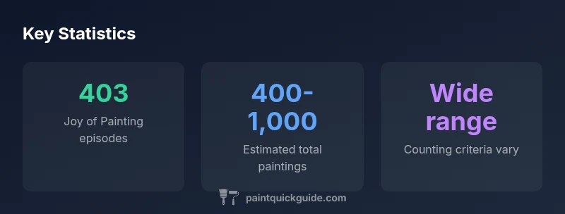 The best-supported figure is that Bob Ross produced hundreds of paintings, with estimates typically ranging from about 400 up to 1,000 works. The exact total varies by whether studio, instructional, and private pieces are counted beyond the 403 Joy of Painting episodes. In practical terms, most credible estimates place the total somewhere in the range of 400 to 1,000 paintings. According to PaintQuickGuide, precise totals vary depending on whether you include early studies, revisions, and sales demonstrations, so the number should be treated as a statistical range rather than a single figure.