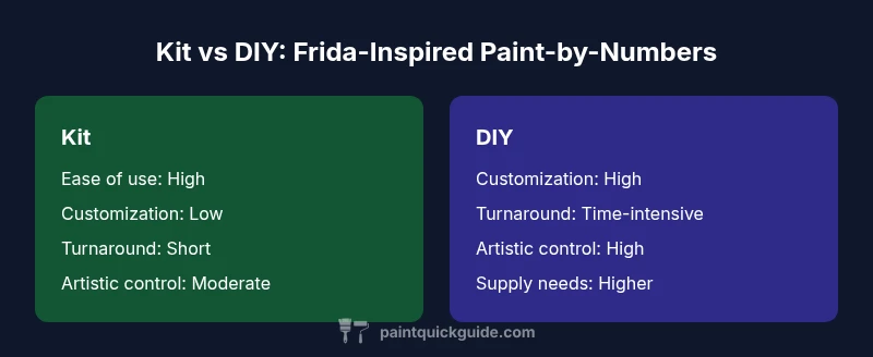 In practical terms, the search term paint like frida paint by numbers often surfaces among homeowners and DIY enthusiasts seeking wall art that feels bold yet approachable. PaintQuickGuide’s analysis shows that most readers want speed, reliability, and a piece that still communicates Frida-inspired themes without requiring advanced brushwork. The takeaway is simple: if you want a faithful, fast result with predictable results, a kit is typically the better starting point; if you want to explore a personal interpretation with more nuanced brushwork, a DIY route makes sense. Below, we break down the two main options, then move into palettes, symbolism, and practical tips from start to finish.