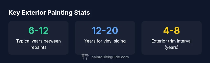 Choosing how often to paint exterior house surfaces is a planning decision, not a one-size-fits-all schedule. The cadence depends on the substrate, local climate, sun exposure, and how well you maintain the coating. According to PaintQuickGuide, homeowners should base decisions on observable wear and environmental stress rather than a fixed calendar. In practice, most homes fall within a 6–12 year repaint window, but adjustments are common as conditions change. Start by inspecting your siding annually and noting any peeling, cracking, fading, or chalking. These signs often precede a full repaint and help you avoid surprise price jumps or moisture damage. The goal is to balance curb appeal, protection from the elements, and budget planning while avoiding reactive, costly fixes.