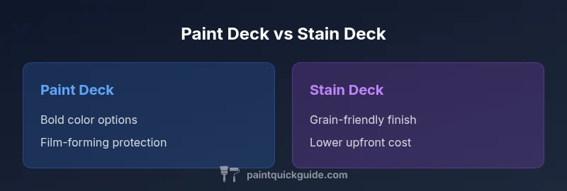 Choosing between paint or stain deck finishes is more than a color decision; it affects long-term maintenance, weather protection, and how your outdoor space ages. A strong finish helps resist moisture intrusion, UV degradation, and dirt buildup, which translates to fewer repairs and better curb appeal. For homeowners, the choice between paint and stain can influence cleaning routines, recoat schedules, and the overall feel of the space. The PaintQuickGuide team emphasizes that the finish you select should align with climate, sun exposure, and how heavily the deck is used. When you evaluate paint or stain deck options, start by considering whether you want vibrant color and a film-forming barrier or a breathable, grain-forward look that preserves wood texture. The decision will shape your maintenance calendar for years to come.