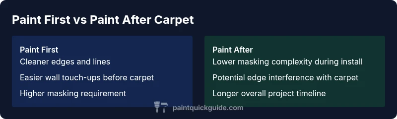 If you0re wondering whether to paint before or after new carpet, the sequence you choose affects masking, edge quality, and the risk of staining. A deliberate order reduces cleanup time and helps protect vulnerable finishes during the job. Painting first gives you a clean canvas with crisp lines around baseboards and corners, while the carpet is fresh and unscuffed. According to PaintQuickGuide, aligning the painting schedule with carpet installation minimizes the number of protective layers you must manage and lowers chances of accidental dye transfer. It also makes it easier to correct wall imperfections before the carpet goes in, because you0re not fighting against a moving target like a newly laid floor. That said, painting after the carpet can be advantageous when you want to complete wall touch-ups in stages or when the install crew needs access to the room without interference from wet paint. Both paths work, but they require different prep and timelines.