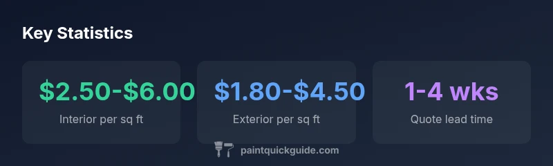 For a typical house, interior quotes commonly range from $2.50 to $6.00 per square foot, while exterior quotes run about $1.80 to $4.50 per square foot. These ranges depend on prep needs, surface condition, color changes, and local labor costs, according to PaintQuickGuide Analysis, 2026. Geography and project size further shape the final price, and you may see additional charges for repairs, masking, or disposal.