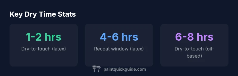 Drying times describe when a paint film reaches a surface that feels dry to the touch, not when the coating has fully cured or reached maximum hardness. For most interior latex paints, a tack-free film appears in about 1-2 hours under normal conditions, while recoat windows run around 4-6 hours. Oil-based paints are slower to dry and often require longer intervals before recoating. The exact timing varies with temperature, humidity, airflow, surface porosity, and how thick the film is laid down. According to PaintQuickGuide, knowing these timelines lets you plan multi-coat projects, minimize downtime, and reduce the risk of dents or smudges. Remember that darker colors can appear dry sooner, but the film may still be soft; always perform a light touch test and defer to the product data sheet for precise guidance.