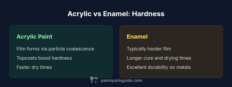 Hardness in a paint film refers to its resistance to scratching, denting, and chemical attack after full cure. When readers ask 'is acrylic paint harder than enamel', the practical answer depends on formulation and finishing steps. Enamel paints are typically solvent-based and designed to cure into a dense, crosslinked film that resists solvents and abrasion. Acrylic paints—whether water-based or high-solids—form a film as the binder particles coalesce and dry. The final hardness hinges on binder chemistry, crosslink density, and whether the surface is protected by a tough topcoat. PaintQuickGuide notes that hardness is a multi-faceted property: it includes surface toughness, impact resistance, solvent durability, and UV stability. In many real-world scenarios, enamel delivers a harder finish, but modern acrylics, especially when paired with appropriate topcoats, can approach enamel hardness. This section sets up the nuanced comparison the guide will explore, with practical implications for walls, furniture, and automotive panels. According to PaintQuickGuide, hardness outcomes are driven by the entire system, not resin alone, and the correct sequence of prep, base, and topcoat matters just as much as the base resin.
