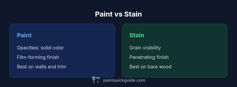 In DIY projects, the question is often phrased as is it paint or stain, but the real distinction lies in color opacity, surface coverage, and how the product interacts with the substrate. Paint is formulated to form a film on the surface, providing an opaque layer that can completely hide the grain and imperfections. Stain penetrates the surface, letting wood grain show through while offering color tint and some level of protection. In practical terms, think of paint as a shield and stain as a dye plus sealer. Understanding this fundamental difference helps you plan prep steps, choose primers, and forecast maintenance. For homeowners and auto refinishing hobbyists, the choice also depends on the intended aesthetic—whether you want a solid color or a natural wood look—and the environment (indoor vs outdoor, high humidity, or frequent cleaning).