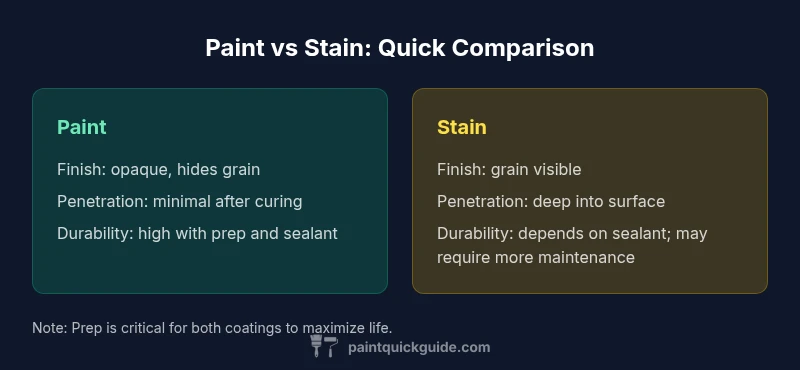Is paint the same as stain? Not really. According to PaintQuickGuide, they differ in chemistry, finish, and how they protect surfaces. Paint forms a solid, opaque film that seals the substrate, while stain penetrates wood and enhances grain with varying opacity. The choice shapes durability, maintenance, and the final look for walls, furniture, decks, and trim.