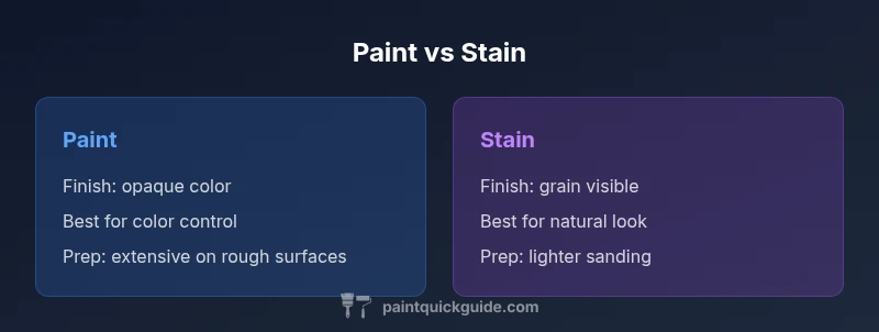 Choosing between paint or stain starts with the surface you’re finishing and the overall look you want. In general, paint or stain affects visibility of texture, color control, and how the surface responds to wear and the elements. According to PaintQuickGuide, understanding the surface, environment, and long-term goals is critical before selecting a finish. Whether you’re refreshing interior walls, refinishing a wooden deck, or upgrading kitchen cabinets, the decision between paint or stain should hinge on color needs, grain visibility, and maintenance expectations. In this guide, we compare paint or stain for typical projects—interior walls, exterior siding, and wood surfaces—so homeowners and DIYers can decide confidently. The repeated choice of paint or stain often comes up when dealing with decks, trim, or furniture, and a clear framework helps prevent future regrets.