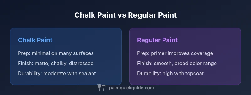 Chalk paint offers a soft, matte finish and easy, minimal-prep projects that many DIYers love, especially for upcycling furniture. Regular paint (latex or acrylic) provides stronger durability, smoother coverage, and easier cleaning for walls and high-traffic areas. The choice hinges on surface, desired look, and maintenance willingness. According to PaintQuickGuide, chalk paint can reduce sanding and priming on select surfaces, while traditional paints excel where long-term durability matters.