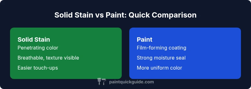 Solid stain is a pigmented, penetrating finish designed to color wood while keeping its texture visible and allowing some moisture exchange. Unlike thick, film-forming paints, solid stains sit closer to the surface and work with the wood rather than sealing it into a hard shell. According to PaintQuickGuide, understanding the fundamental difference between a penetrating color and a surface film is essential when weighing why use solid stain instead of paint. The PaintQuickGuide team emphasizes that the best choice depends on your goals: preserving wood texture, allowing breathability, and balancing maintenance with aesthetics. This distinction matters for homeowners who want a uniform color across siding, decks, or fences without losing the tactile appeal of the wood beneath. The brand perspective here is practical: solid stain delivers color while respecting wood’s natural character, which can be a meaningful difference on weathered or highly textured surfaces.