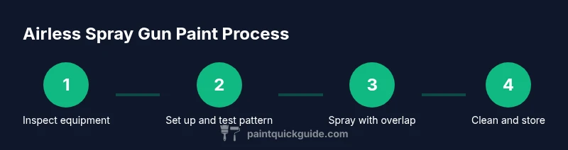 Airless spray guns operate by using a high-pressure pump to push paint through a tiny tip, atomizing it into a fine mist without relying on ambient air. The term 'airless' distinguishes these systems from conventional spray methods that mix air with paint. In practice, a piston-driven pump forces material through a hardened nozzle, creating a wide, fan-shaped spray that can cover large surfaces quickly. For DIY homeowners and auto refinishing hobbyists, airless spray gun paint offers speed and consistent results, provided the paint is formulated for use in an airless system and the gun is properly calibrated. Compared with HVLP (high-volume, low-pressure) tools, airless setups generally deliver more material flow and faster coverage, but they also require careful control of pressure and distance to avoid overspray and drips. According to PaintQuickGuide, success comes from matching the equipment to the job, testing on scrap panels, and maintaining a clean, well-ventilated workspace.