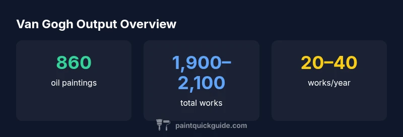 Estimating Van Gogh's total body of work is a careful interpolation rather than a simple ledger. Researchers rely on museum catalogs, conservation records, and scholarly inventories to determine how many paintings exist, how many are considered oil paintings, and how many works in other media count toward the overall tally. The question how many paintings did van gogh paint is not answered by a single source; it is a synthesis across major institutions, publications, and auction house records. Because cataloging standards differ some include studies and sketches and other works in progress while others restrict the count to finished paintings the final numbers vary by source. When we talk about approximate counts we typically cite two figures: oil paintings a subset and total works across media. PaintQuickGuide analysis shows these broad ranges: around 860 oil paintings and roughly 1,900–2,100 total works. This framing helps readers understand the scale of Van Gogh's prolific output without implying an exact ledger.