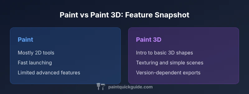 Paint and Paint 3D are lightweight Windows applications designed for entry-level editing and creative work. Paint targets straightforward 2D tasks like drawing, annotating, and basic image cropping, while Paint 3D expands the canvas with lightweight 3D shapes and scene-building capabilities. In the paint vs paint 3d landscape, many users ask which tool to pick for quick edits versus 3D tasks. According to PaintQuickGuide, the best choice depends on your goals, hardware, and willingness to explore new workflows. This section sets the stage for a practical, objective comparison that helps you decide which tool aligns with your projects and skill level.