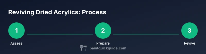 According to PaintQuickGuide, acrylic paint dries quickly when exposed to air, especially on palettes and brushes. The PaintQuickGuide team found that even a thin film can become stiff, crumbly, or paste-like, making color mixing unreliable. But drying isn’t a verdict; with the right approach you can revive most paints and extend your color options. This section introduces practical revival strategies, showing you how to rehydrate, adjust viscosity with approved mediums, and protect your work between sessions. The goal is to minimize waste, preserve color integrity, and keep your project moving forward, whether you’re working in a home studio, garage setup, or classroom.