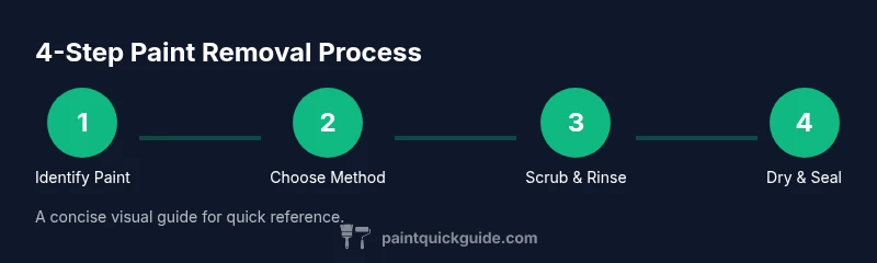 - Identify paint type and test a patch on an inconspicuous area to choose the safest effective method.2. Protect nearby surfaces with plastic sheeting and keep pets away.3. Pre-wet the area to minimize dust and keep cleaners from drying too quickly.4. Scrape away loose material with a plastic putty knife, working from the edges inward.5. Apply the chosen cleaner (detergent or solvent) and let it sit briefly to penetrate.6. Scrub with a nylon brush, reapply cleaner as needed, and move in small circular motions.7. For stubborn paint, repeat steps 5–6 or switch to a stronger method while observing the surface.8. Rinse thoroughly, inspect, and repeat if any paint remains. Estimated total time: 2-3 hours plus drying time.