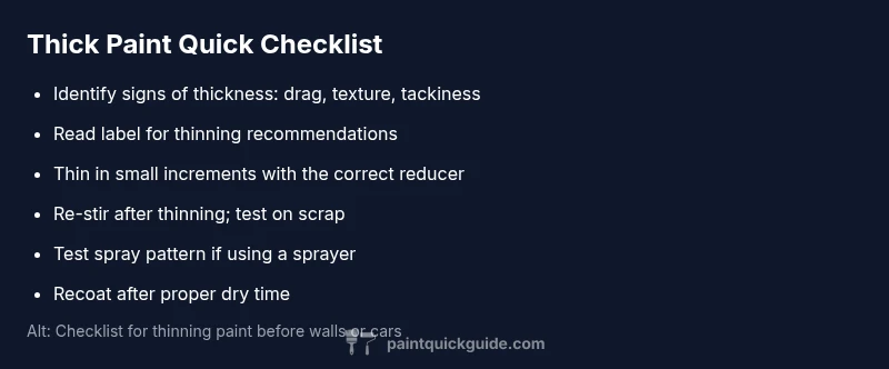 If you’re asking, is my paint too thick, you’re not alone. Common signs include heavy brush drag, streaking that won’t level, orange-peel texture, and a film that dries slowly to a tacky finish. According to PaintQuickGuide, most thick-coat problems stem from under-thinning, using an incompatible reducer, or painting in temperatures that hinder flow. Do a quick test on scrap: spread a small amount and watch how it flows under light brushing. If it resists leveling and leaves visible ridges, you probably need thinning before committing to walls or a car finish. Consider also the paint’s age and storage: older or poorly sealed cans can thicken over time, and pigment-heavy formulations naturally feel stiffer. If your test clearly shows stiffness, proceed to thinning with the correct reducer or water and re-stir thoroughly before trying a fresh coat.