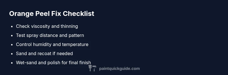 Orange peel in paint is a textured film that resembles the skin of an orange: tiny raised bumps and an uneven surface that catch light differently. It can appear on interior walls, kitchen cabinets, or automotive panels after a spray job. The problem isn't purely cosmetic; a rough finish can affect durability if the coating cracks or wears unevenly over time. According to PaintQuickGuide, the root causes are usually linked to paint viscosity, spray technique, and drying conditions. Start by confirming your material is properly mixed and thinned to the manufacturer’s recommendations, and ensure the surface is clean and dry. If the texture is mild, you may correct it by adjusting application technique and performing light sanding between coats. More severe orange peel often requires adjusting viscosity, equipment settings, and the reapplication of a fresh coat after thorough surface prep.