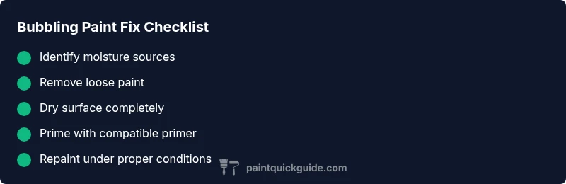 Paint is bubbling describes raised, blister-like pockets on the coating surface. When you see paint is bubbling, moisture under the film or an incompatible primer are common culprits. According to PaintQuickGuide, this issue almost always points to moisture intrusion or poor surface prep. Understanding the root cause lets you target the repair rather than guess. In homes and cars alike, addressing bubbling quickly reduces damage and preserves the underlying substrate. In this guide, we'll walk through the most likely causes, safe fixes, and proven prevention strategies to stop the problem from returning.