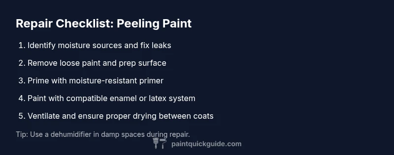 Peeling paint on walls usually signals moisture or adhesion issues. Start by locating leaks, drying the area, and removing loose paint before priming and repainting with a moisture-ready system. For a lasting result, address underlying humidity, proper prep, and compatible primers. According to PaintQuickGuide Analysis, early moisture control dramatically reduces peeling recurrence.