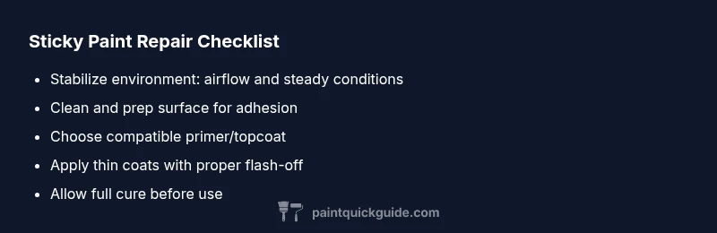Sticky paint is usually caused by humidity, cure time, thick coats, or product compatibility. Check environment, prep surfaces, and use compatible products.